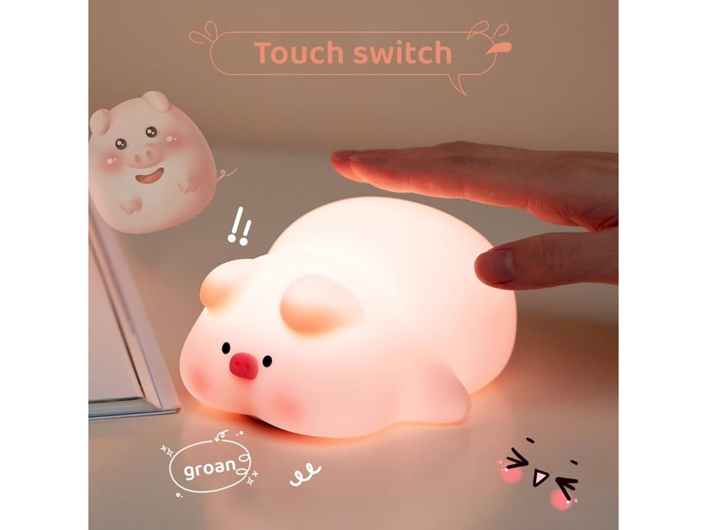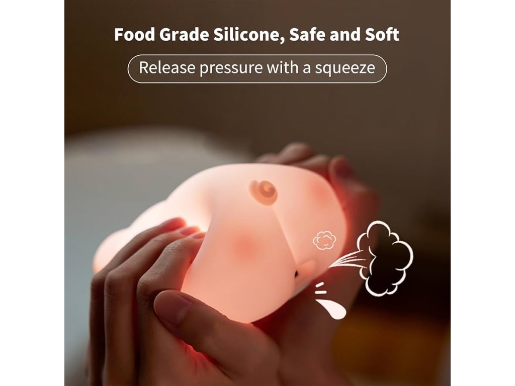 Tato roztomilá silikonová lampička ve tvaru prasátka je ideální doplněk do dětského pokoje nebo ložnice. Poskytuje příjemné žluté světlo ve 3 intenzitách, které pomáhá vytvořit příjemnou atmosféru vhodnou pro odpočinek nebo usínání. Lampička je vyrobena z nezávadného potravinářského silikonu a ABS materiálu bez BPA, což ji činí bezpečnou i pro ty nejmenší děti. Její roztomilý design z ní dělá perfektního společníka do dětského pokoje pro děti i originální dekoraci.