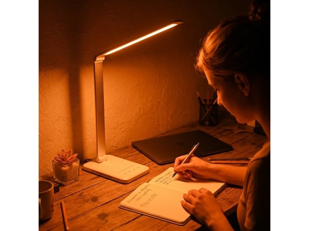 Lampička je navržená pro práci, studium i čtení u stolu, kde oceníte možnost rychle přepínat mezi bílým, přirozeným a teplým světlem. Ohebný krk nastavíte do různých úhlů a směrů, takže si osvítíte klávesnici, sešit i pracovní desku bez zbytečného svícení do okolí. Pro večerní režim jsou k dispozici také oranžové a červené tóny, které pomáhají vytvořit klidnější atmosféru. Díky CRI >85 působí světlo přirozeně a barvy na papíře i předmětech na stole vypadají věrně. Ovládání probíhá přes dotykový panel, kde nastavíte jas i barvu světla jedním plynulým pohybem.