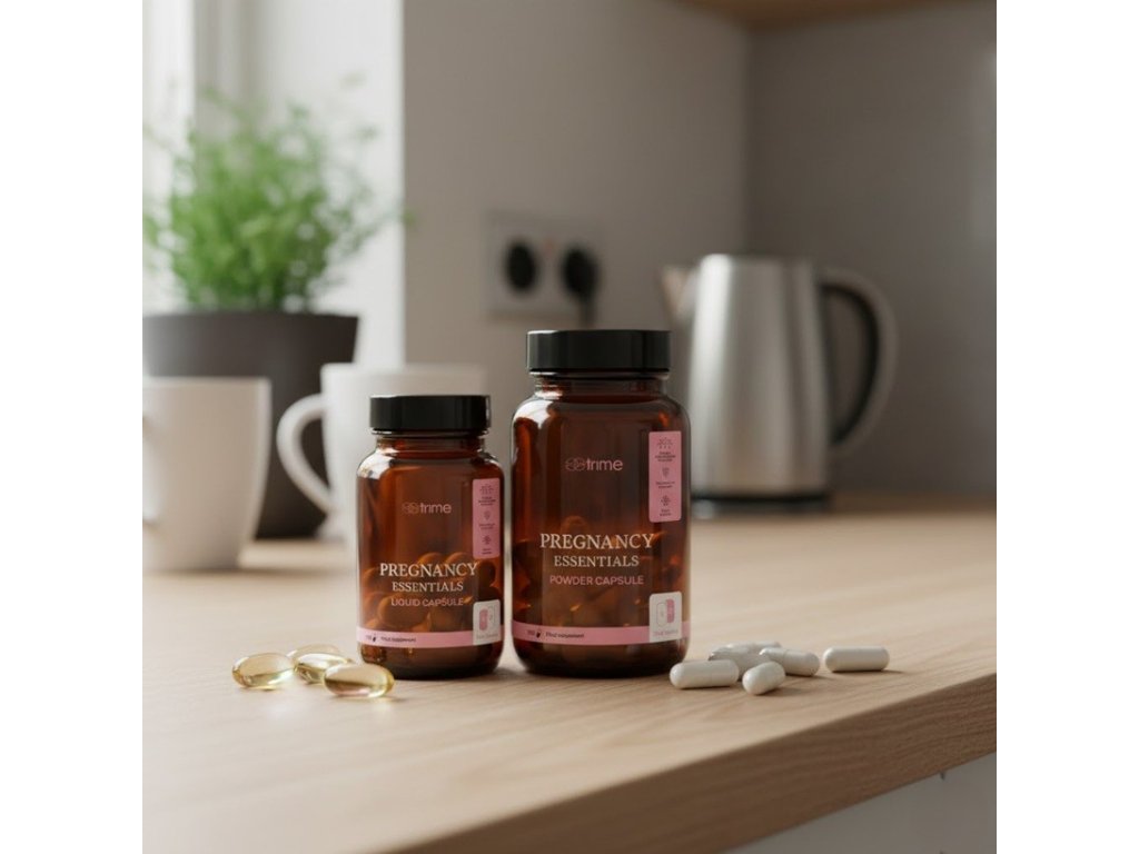 Trime Pregnancy Essentials je prémiový těhotenský multivitamín navržený tak, aby poskytoval maximální podporu organismu ženy během těhotenství i kojení. Tento produkt se vyznačuje pečlivě vyváženou kombinací esenciálních vitamínů, minerálů a bioaktivních látek, které přispívají ke zdravému vývoji plodu, správnému dělení buněk a celkové vitalitě maminky. Využívá inovativní technologii Duo Caps, která spojuje 2 práškové kapsle a 1 tekutou kapsli denně. Tímto způsobem se zajišťuje stabilita citlivých živin a jejich vysoká vstřebatelnost. Pokud hledáte čisté, účinné a promyšlené složení bez zbytečných aditiv, právě jste ho našla. Trime Pregnancy Essentials dodává klíčové živiny, které jsou důležité pro správný růst a vývoj dítěte, a zároveň pomáhá mamince udržet energii a psychickou pohodu.