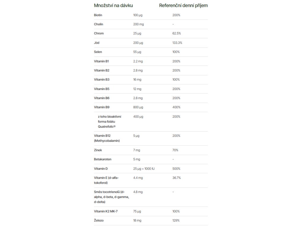 Trime Pregnancy Essentials představuje důležitou součást výživy pro každou nastávající maminku. Obsahuje bioaktivní folát Quatrefolic® (5-MTHF), což je aktivní forma vitamínu B9, která přispívá ke správnému dělení buněk a růstu zárodečných tkání během těhotenství. Železo v chelátové formě bisglycinátu železnatého podporuje tvorbu červených krvinek, což je nezbytné pro dodávání kyslíku plodu. Vitamíny skupiny B a jód pozitivně ovlivňují činnost nervové soustavy a psychickou aktivitu, což je klíčové pro zdravý vývoj dítěte. Cholin L(+) bitartrát hraje zásadní roli ve vývoji mozku plodu a podporuje kognitivní funkce, což přispívá k lepšímu rozvoji dítěte. Antioxidanty jako vitamín E, zinek a selen pomáhají chránit buňky před oxidativním stresem.
