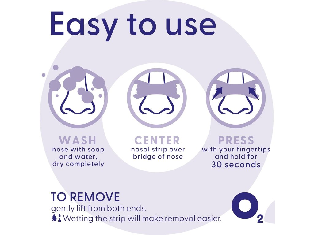 Aplikace je snadná – umyjte nos mýdlovou vodou, osušte, pásku přiložte na kořen nosu a přitlačte po dobu 30 vteřin. Pohodlné a neinvazivní řešení pro každého, kdo si přeje lépe dýchat.