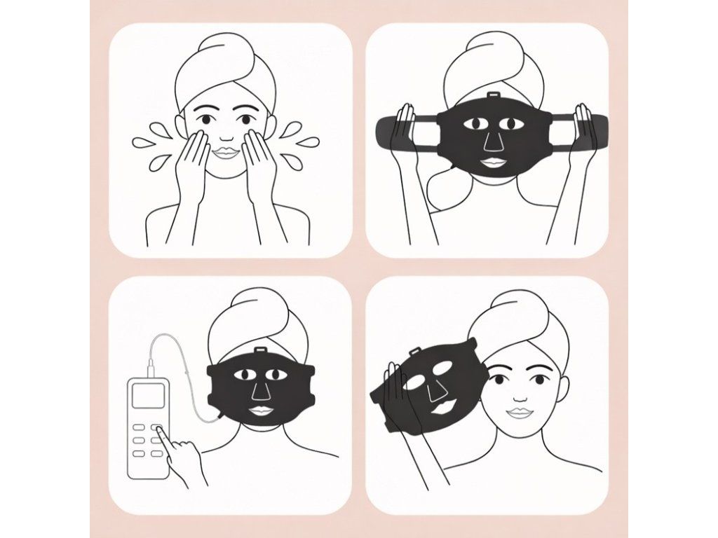 Použití je navržené pro domácí rutinu bez návštěvy salonu. Nejprve pleť důkladně vyčistěte a osušte, aby světlo mohlo působit co nejefektivněji. Masku přiložte na obličej (případně i krk), upevněte pásky a na externím kontroléru s displejem zvolte režim, intenzitu a čas ošetření.
