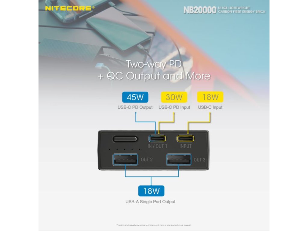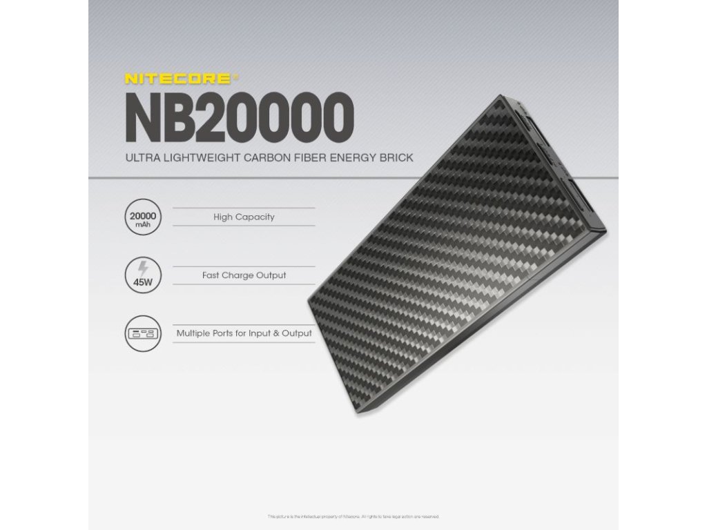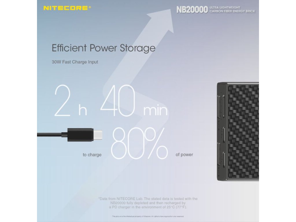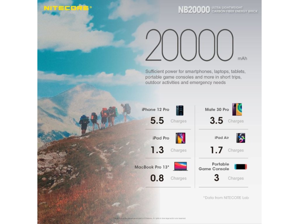 - Kapacita: 20 000 mAh – nabijete až 4x mobilní telefon Huawei P30, akumulátory NITECORE, iPad, MacBook nebo herní konzole.