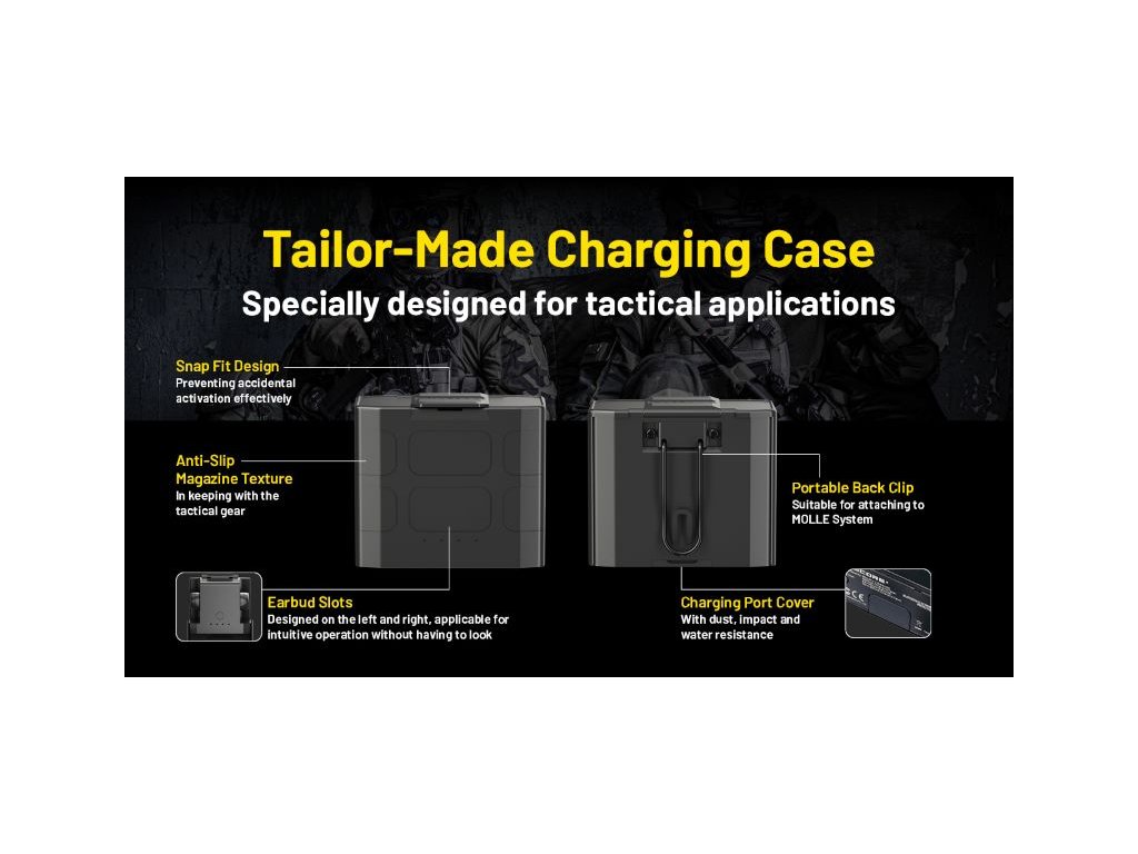 V balení naleznete nabíjecí box s klipem, který lze snadno připevnit na batoh, vestu nebo opasek. Sluchátka poskytují až 8 hodin nepřetržitého provozu, přičemž nabíjecí pouzdro přidává dalších 24 hodin. Sluchátka jsou plně nabita za pouhou 1 hodinu, zatímco nabíjecí pouzdro za 2,5 hodiny pomocí přiloženého USB-C kabelu. Stav nabití pouzdra je indikovaný LED diodami.