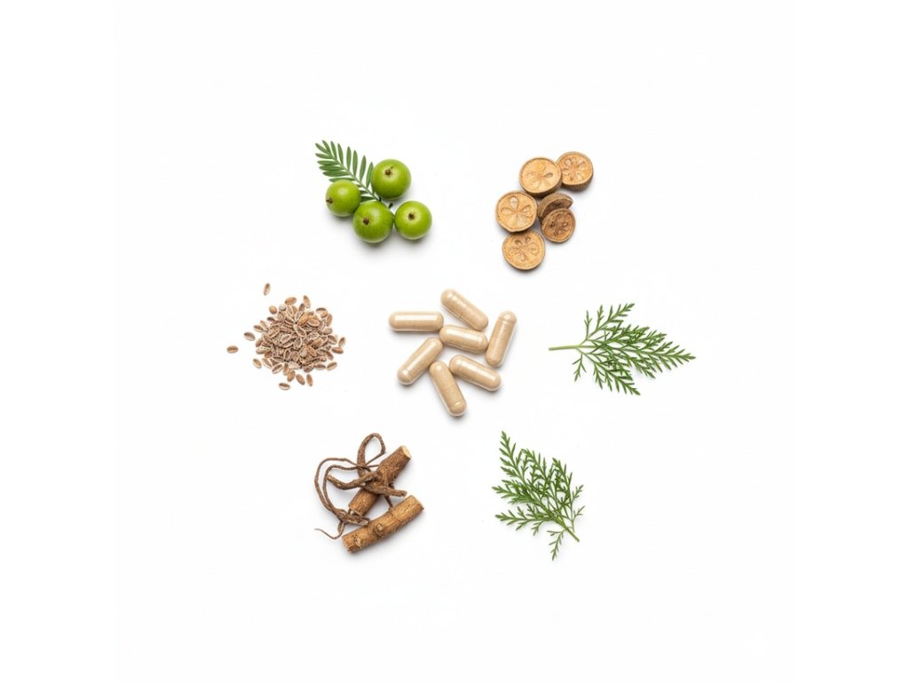 Každá kapsle ukrývá kombinaci tradičně využívaných bylin – haritaki, bahera a amla jsou známé svými očistnými a regeneračními účinky. Doplněné o extrakty ze semen čekanky, listu tamaryšku a kapary trnité vytvářejí synergickou směs, která podporuje normální trávení, střevní pohyb i zdravé fungování jater. Zároveň přispívají k udržení správné hladiny cholesterolu a glukózy v krvi a mají pozitivní vliv na stav pokožky, kostí a kloubů.