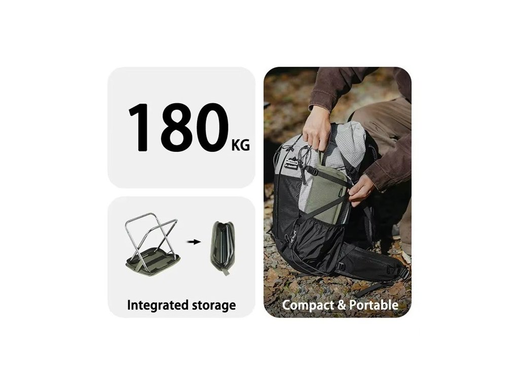 Stolička využívá kvalitní hliníkový rám s křížovou podporou typu X, díky čemuž je stabilní a odolná i na nerovném terénu. Konstrukce je navržena tak, aby nabídla běžnou nosnost 120 kg a maximální zatížení až 180 kg, takže se hodí jak pro běžné výlety, tak pro náročnější outdoorové aktivity. Pevné materiály a promyšlený mechanismus zajišťují spolehlivé používání i při dlouhodobém zatížení.
