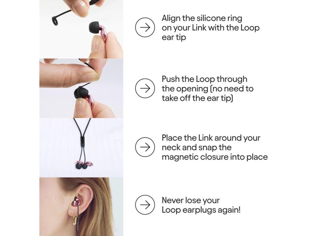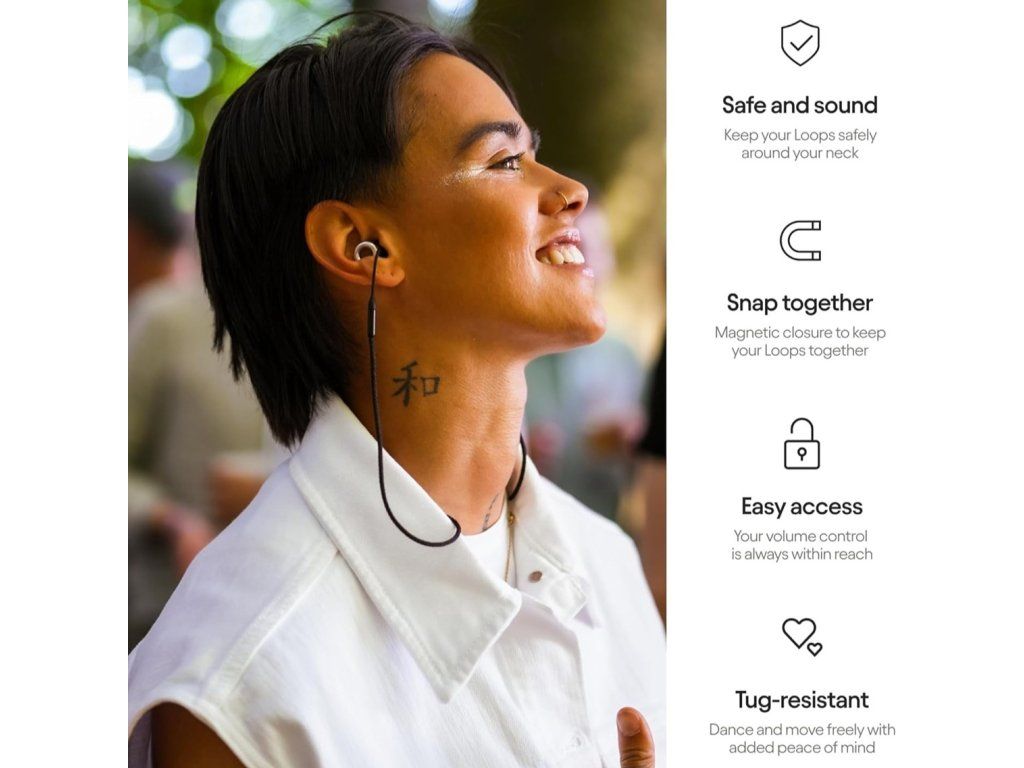 Loop Cord je spojovací šňůrka určená pro špunty do uší Loop. Umožní vám mít špunty zavěšené kolem krku a rychle je nasadit, kdykoliv je potřeba. Díky magnetickému zapínání zůstávají špunty spojené i ve chvíli, kdy je zrovna nepoužíváte, takže je nemusíte hledat v kapse, tašce nebo pouzdře.