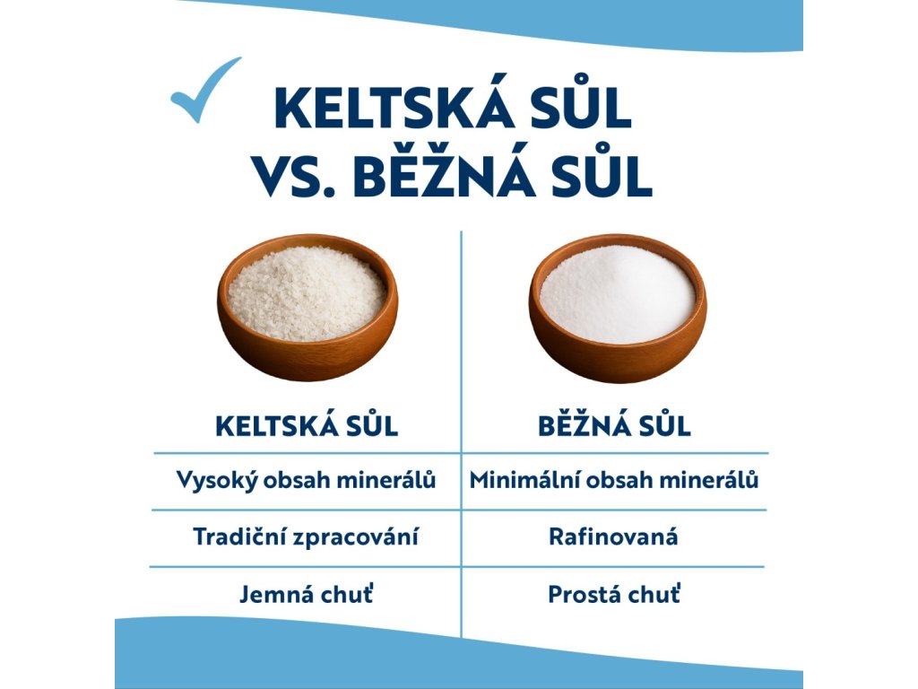 Jemná mořská sůl ručně sbíraná v keltském moři v oblasti Guérande (Francie). Díky tradičnímu sběru a minimálnímu zpracování si zachovává přirozenou vlhkost, minerály a jemně šedé zabarvení. Výborná jak pro běžné vaření, tak pro dochucení hotových pokrmů.