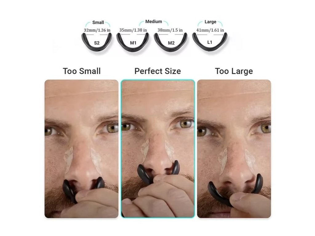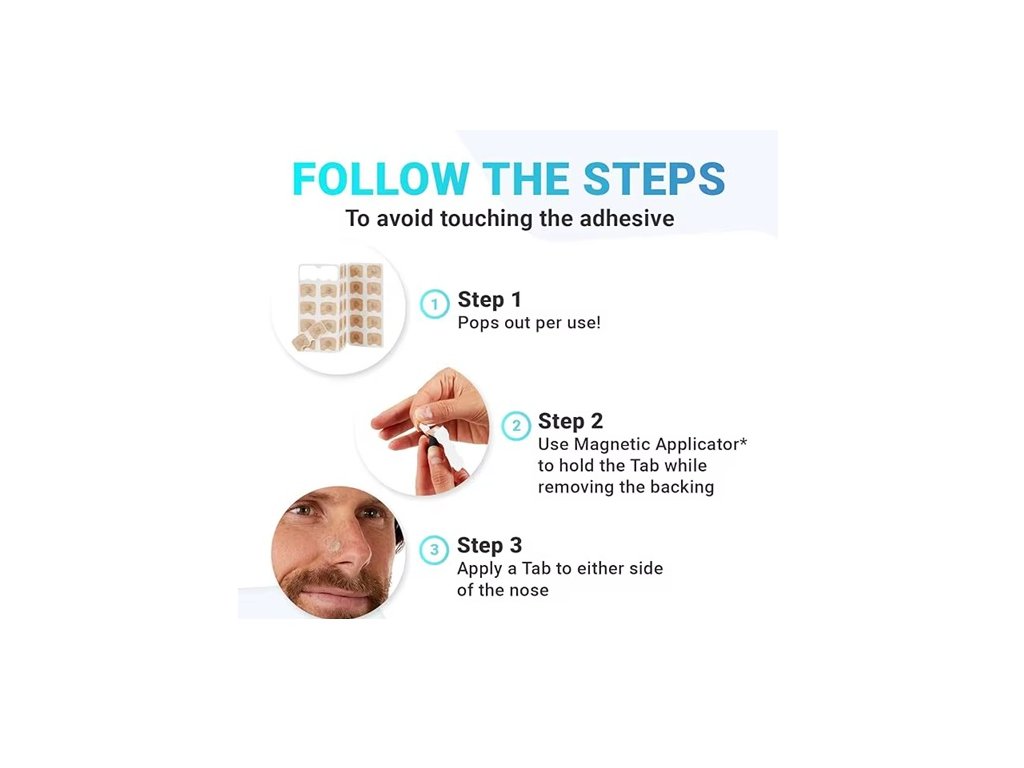 Použití je velmi jednoduché a zvládnete ho během několika vteřin. Po očištění nosní oblasti přiložíte pomocí magnetického aplikátoru nosní nalepovací pásky na obě strany nosu. Následně vyberte vhodnou velikost nosního klipu a ten přiložte z vnější strany přes nos, tak aby se přilepené magnetické náplasti pomocí magnetu přichytily ke klipu. Materiál je lehký, pohodlný a nijak vás nebude omezovat při pohybu ani během spánku. Pro správné umístění náplastí se řiďte tvarem svého nosu - pásky nalepte na měkké tkáně, u kterých bude patrné, že roztáhnout nos po aplikování dilatátoru. Vybírejte se 4 velikostí dilatátoru právě ten, který dokolane padne vašemu nosu.