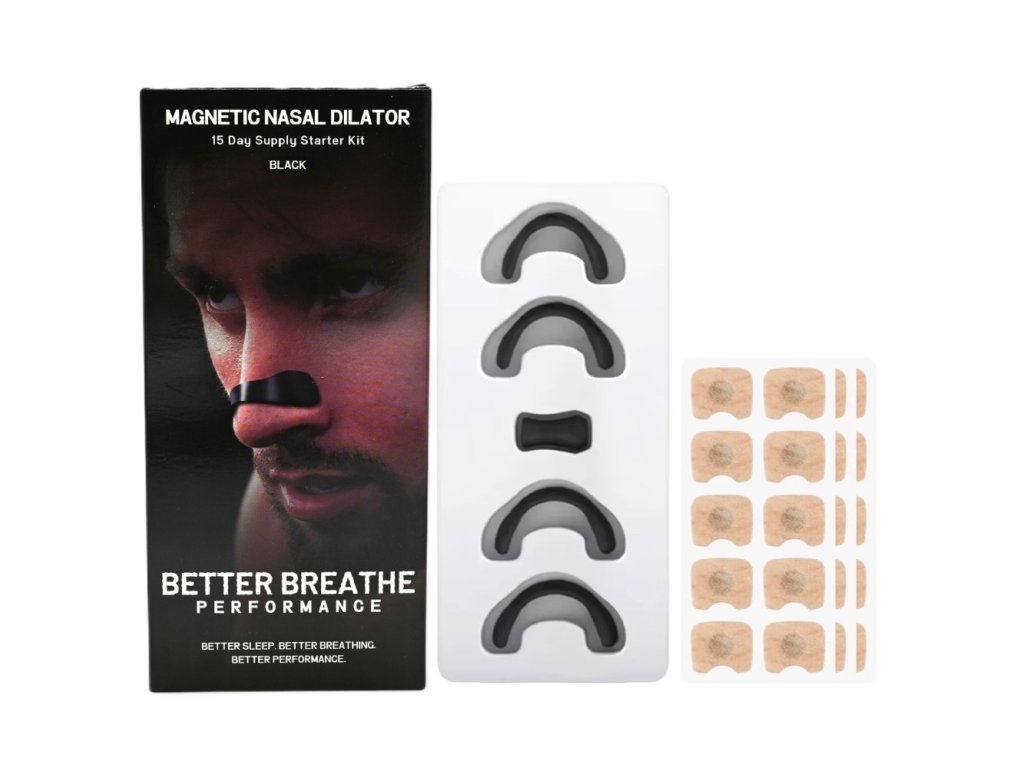Magnetický nosní dilatátor je praktická pomůcka, která pomáhá zlepšit proudění vzduchu nosem – ať už během spánku, při sportu nebo v každodenním životě. Kombinace nosních pásků a klipu jemně rozšiřuje nosní průduchy, čímž zajišťuje volnější a přirozenější dýchání. Tím podporuje lepší okysličení těla, uvolnění a celkovou pohodu.