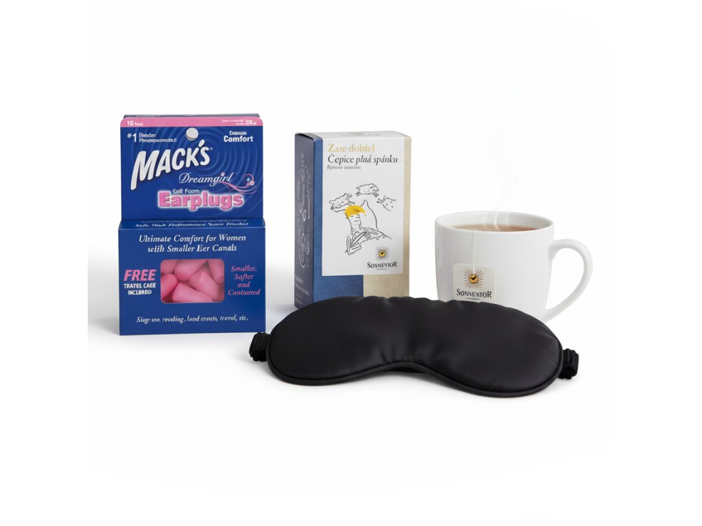 Darujte svým blízkým o dost lepší spánek. V sadě najdete špunty do uší na spaní Mack's Dreamgirl, prémiovou masku na spaní a bylinnou čajovou směs od Sonnentor.