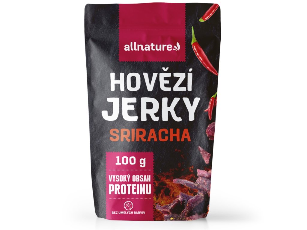 Allnature BEEF Sriracha jerky - sušené hovězí maso se Srirachou - datum spotřeby 03/2026