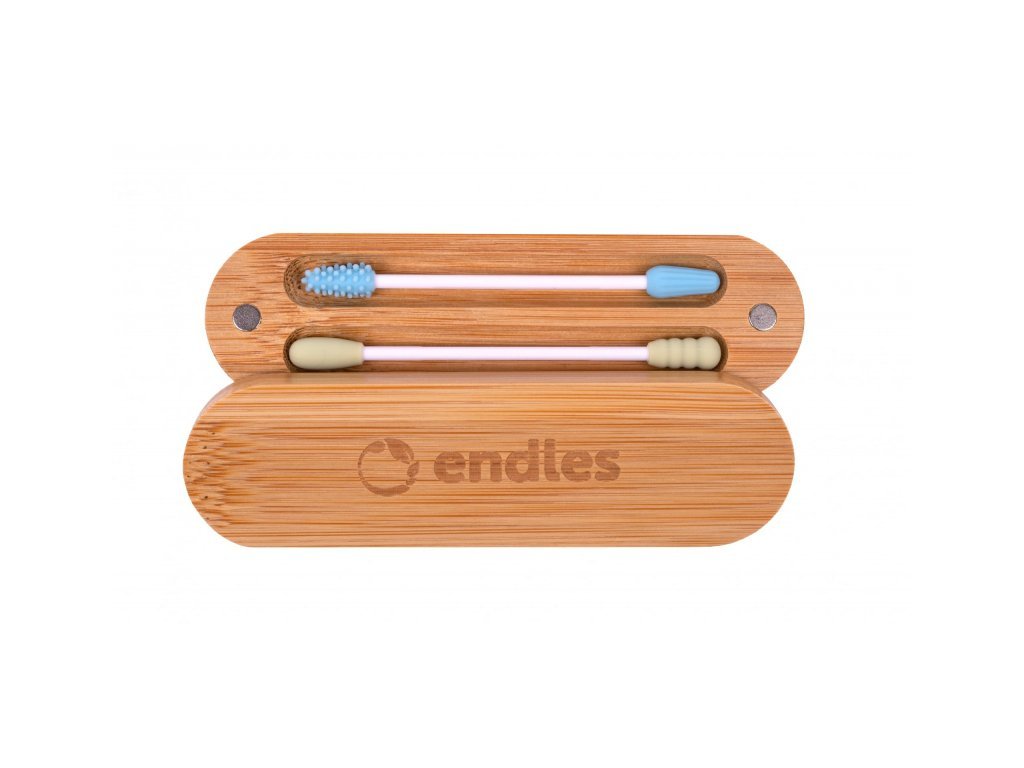 Endles znovupoužitelné tyčinky jsou dva útlé uchošťoury z jemného silikonu, které shrábnou do kapsy stovky jednorázových vatových tyčinek. Jsou omyvatelné a věrné až za hrob. Vroubkovaná tyčinka se hodí k čištění uší, ta s hladkým zakončením pomůže doladit líčení. S oboustrannými šťoury budete zero waste i na cestách. Díky stylovému pouzdru z udržitelně pěstovaného bambusu se nikam nezatoulají a navíc vzbudí obdivné pohledy.