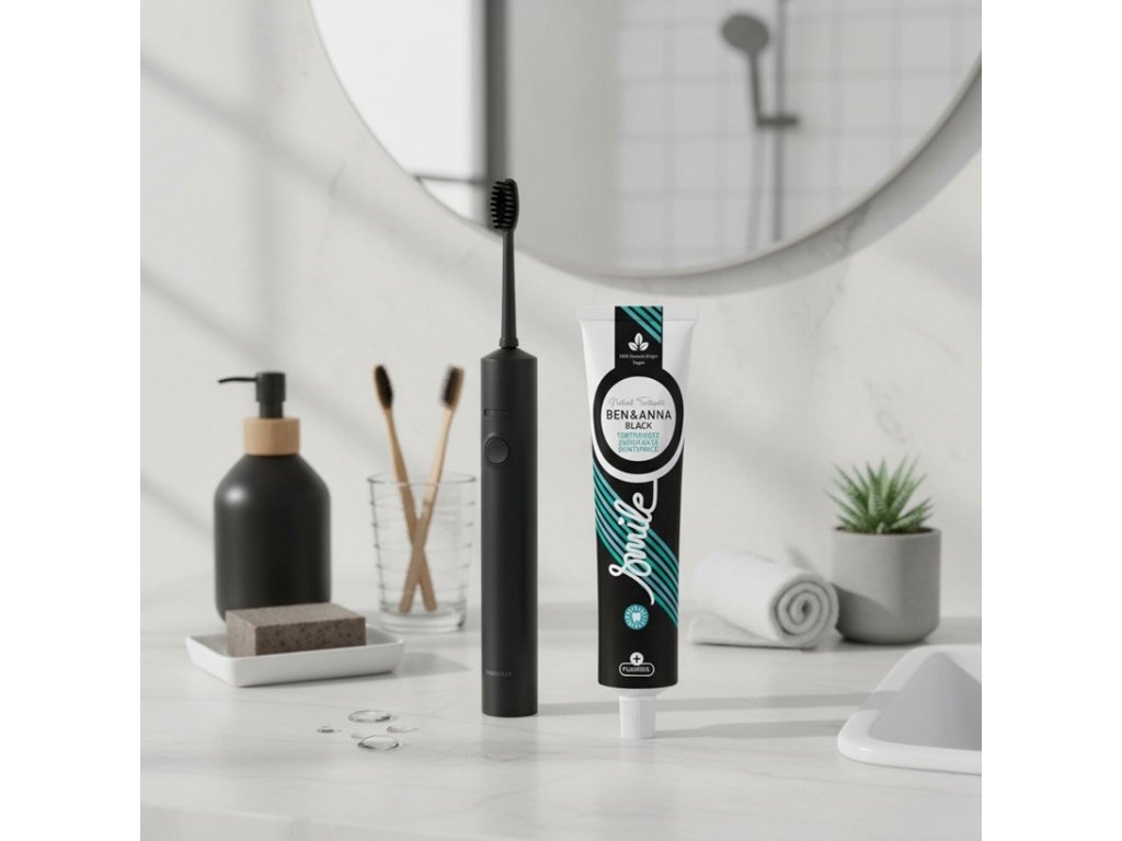 Pasta je 100% přírodní, veganská, bez mikroplastů, parabenů a ftalátů, a nese prestižní certifikace Vegan Society, PETA a NaTrue. Je důkazem, že moderní péče o ústní hygienu může být účinná, šetrná a zároveň ohleduplná k planetě. Objevte sílu černé krásky od Ben & Anna – pasty, která spojuje přírodu, svěžest i styl.